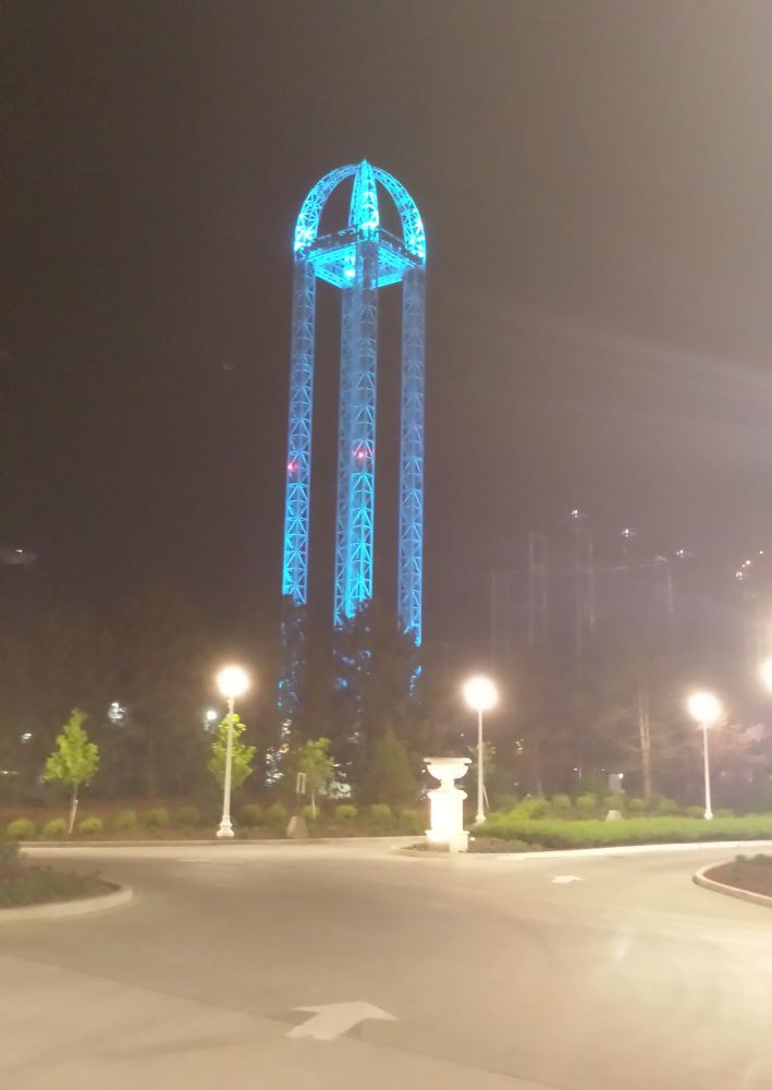 The view of the Power Tower from the hotel all lit up after dark. Pretty sweet.